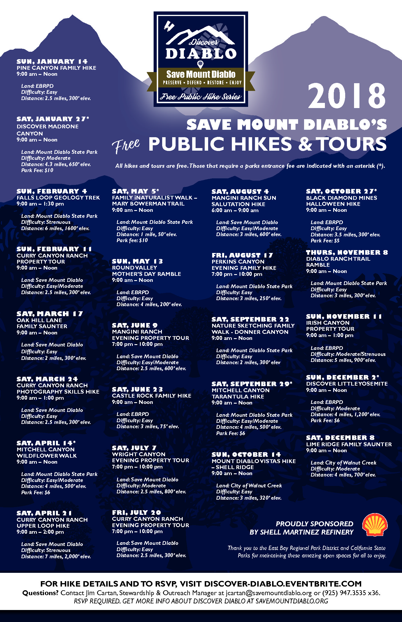 Save Mount Diablo releases an annual schedule of free public hikes, which are publicized at the beginning of each calendar year. In my role as Communications Manager, I designed the branding identity of the program, as well as a suite of print and digital collateral through which the program was marketed, drafted and distributed press releases and blog posts, and also implemented and administered the digital channels through which interested parties could RSVP to attend a hike.